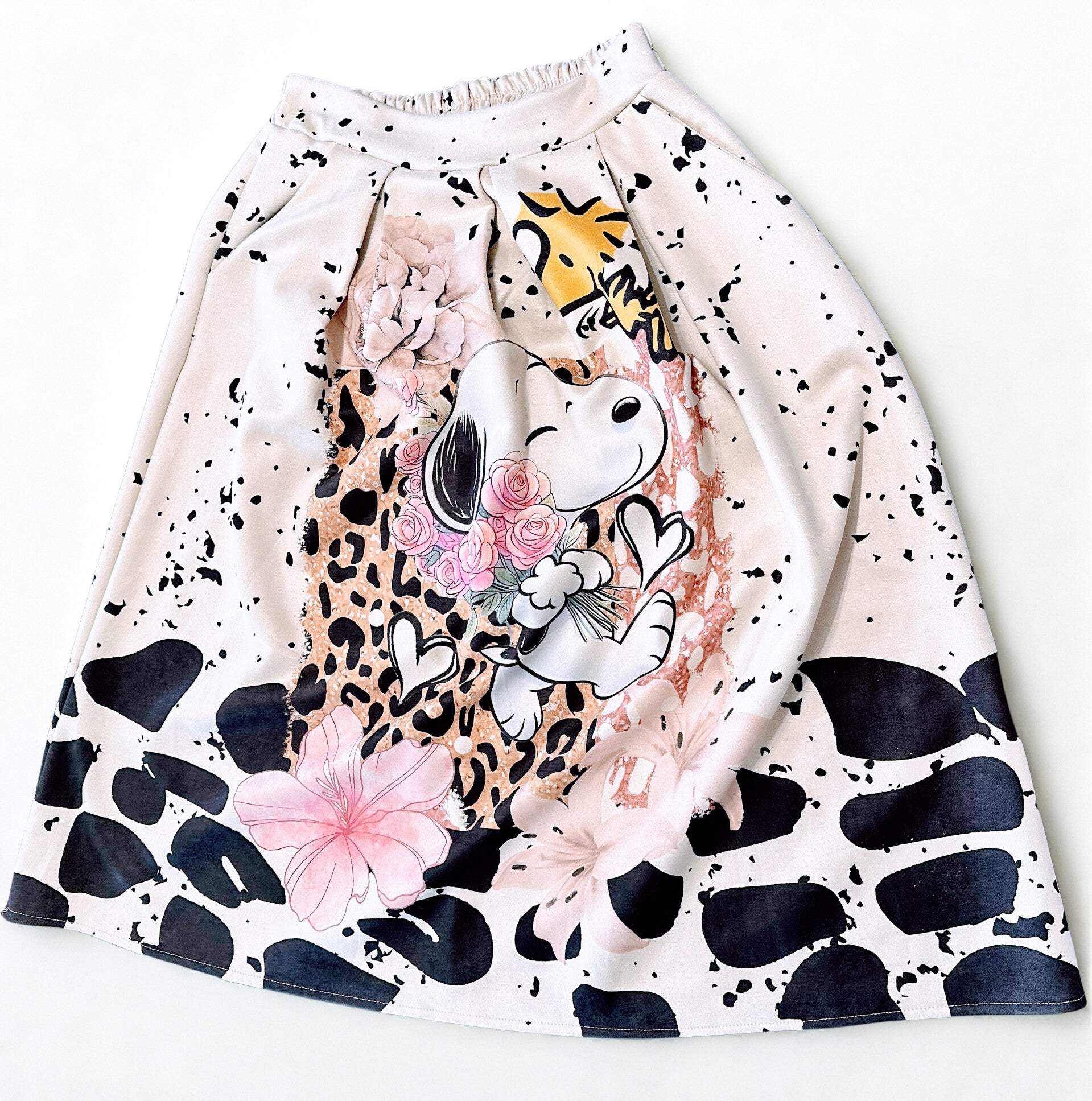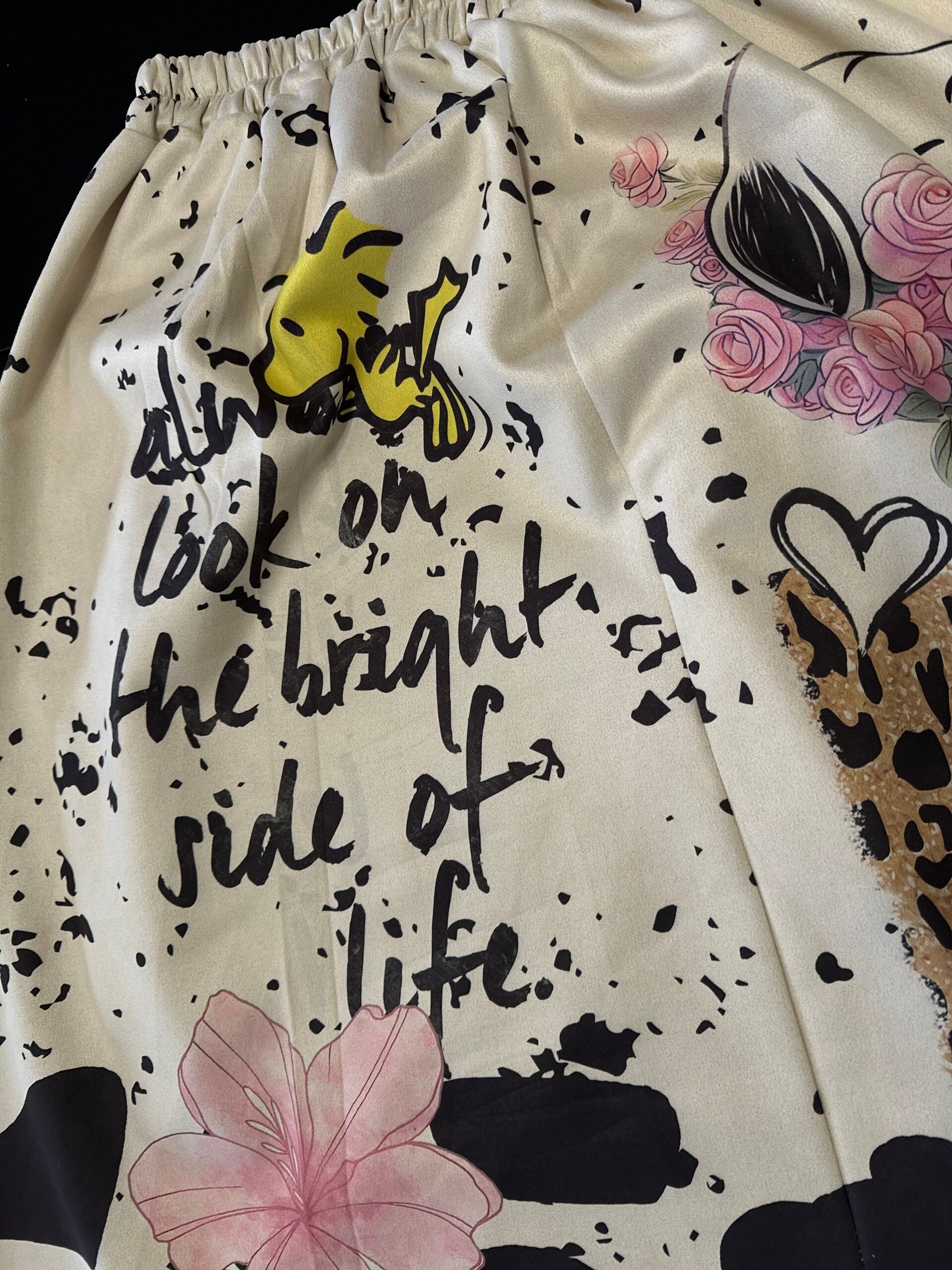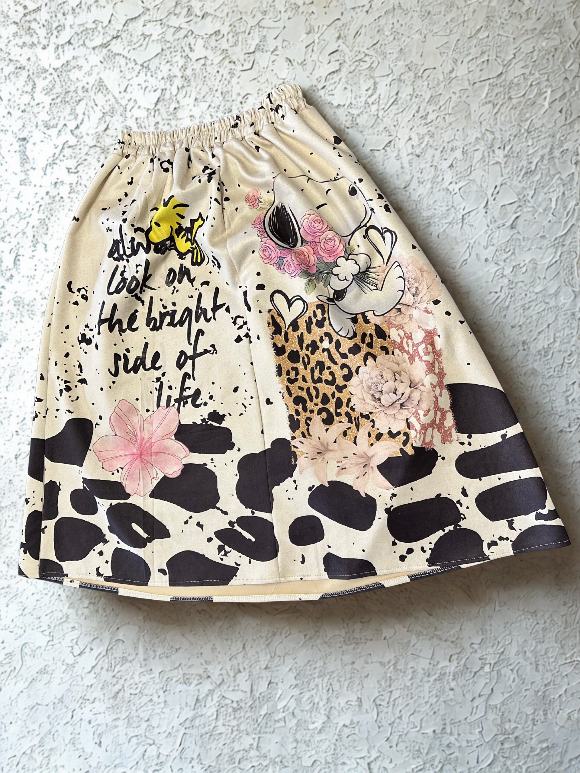 Meravigliosa gonna Midi beige/crema con motivi grafici sovrapposti per un look bon-ton ma rivisitato in chiave pop.