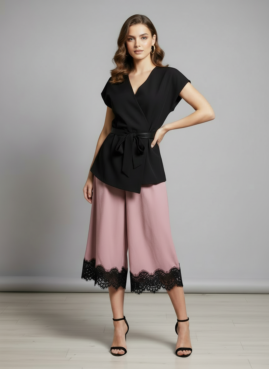 Questi eleganti pantaloni a gamba larga (stile culotte) sono il perfetto equilibrio tra lo stile contemporaneo e un tocco romantico d'altri tempi. Ideali per chi cerca un capo versatile che non passi inosservato, uniscono comfort e ricercatezza in un unico design.