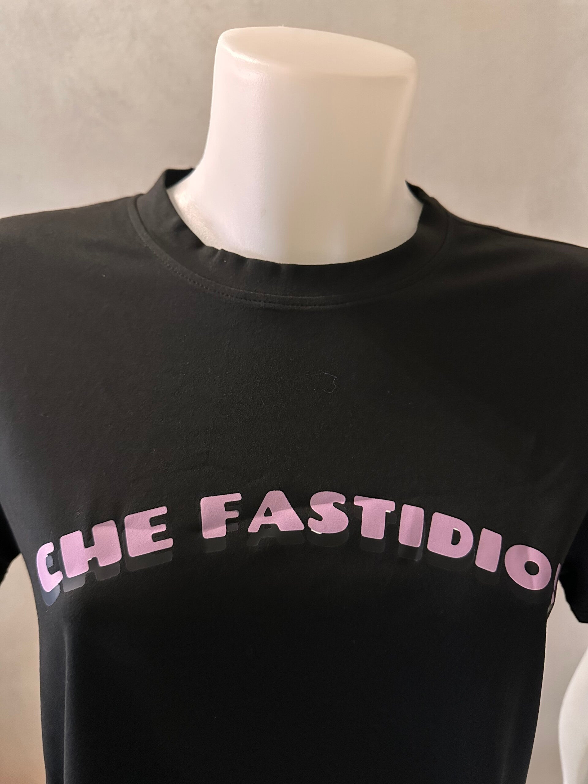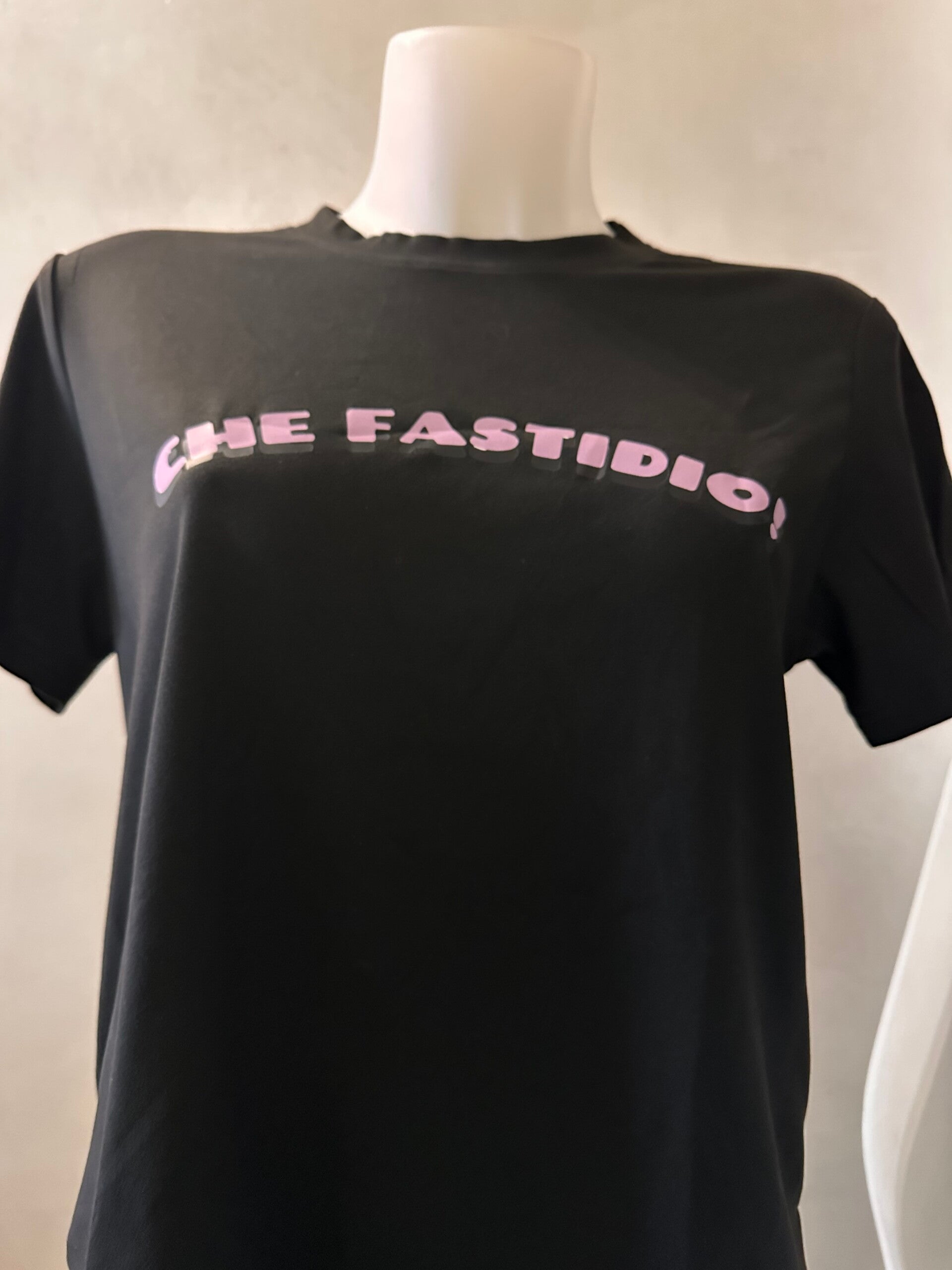 T-shirt poliestere con scritta in evidenza "che fastidio!" Buona vestibilità, tessuto morbido, due colorazioni